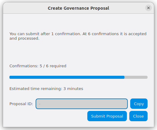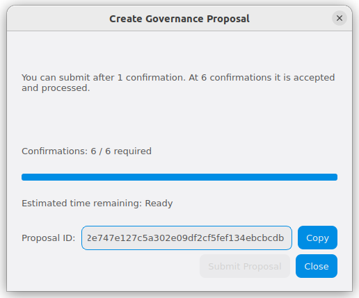 The proposal ID will also be shown on the submission screen. The proposal ID can be used to track voting on the proposal.
