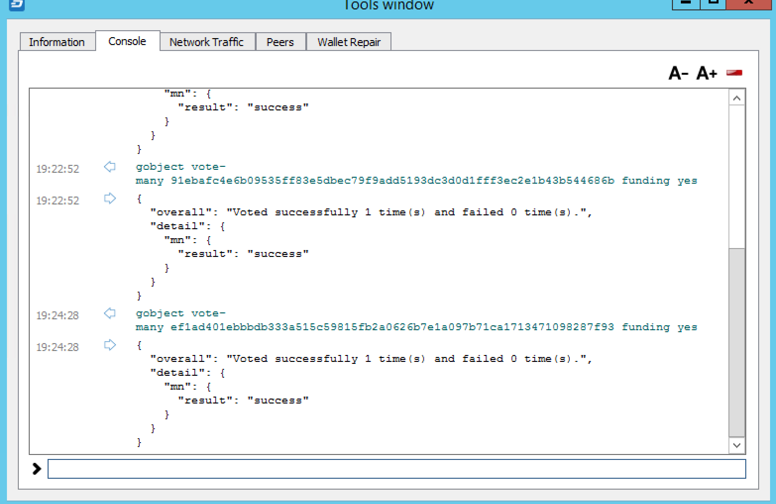 Note this command will trigger a vote from all masternodes configured in dash.conf. If you have multiple masternodes each with its own .conf file, or if you want to vote with only some of your masternodes, you must change the command from vote-many to vote. If your vote was successful, you should see a confirmation message reading Voted successfully.