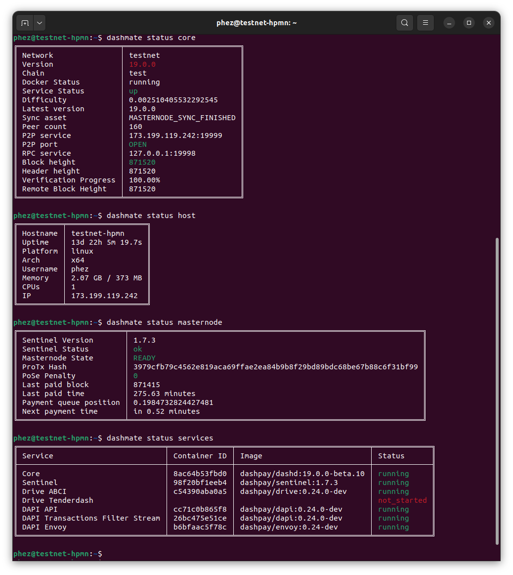 You can check the status of your masternode using the various dashmate status commands as follows: