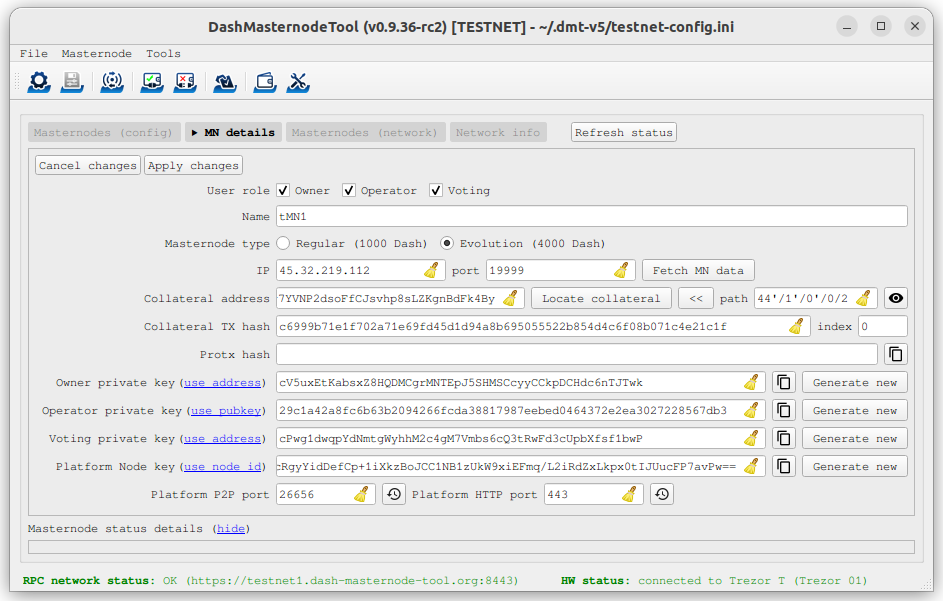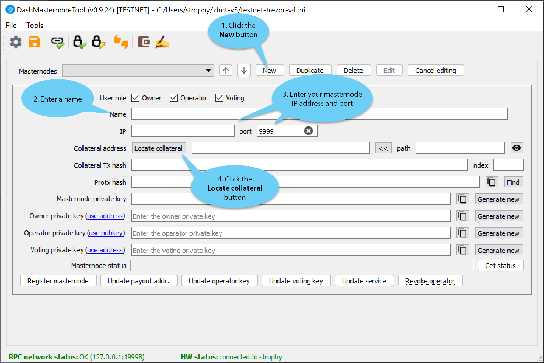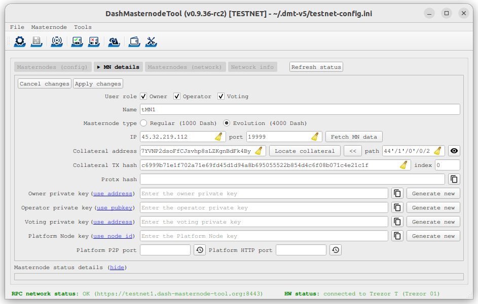 Go back to DMT and ensure that all fields from the previous step are still filled out correctly. Click Generate new for the three private keys required for a masternode: