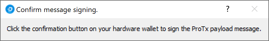 We will now sign the content of the signMessage field using the private key for the collateral address as specified in collateralAddress. Note that no internet connection is required for this step, meaning that the wallet can remain disconnected from the internet in cold storage to sign the message. In this example we will again use Dash Core, but it is equally possible to use the signing function of a hardware wallet. The command takes the following syntax: