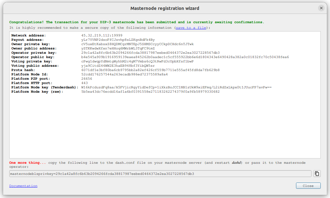The public key will be used in following steps. The private key must be entered in the configuration on the masternode. This allows the masternode to watch the blockchain for relevant Pro*Tx transactions, and will cause it to start serving as a masternode when the signed ProRegTx is broadcast by the owner (final step below). If you are using the BLS key generated by dashmate setup, this information is already configured for your masternode. If you generated your own BLS key pair, edit the dashmate configuration as follows: