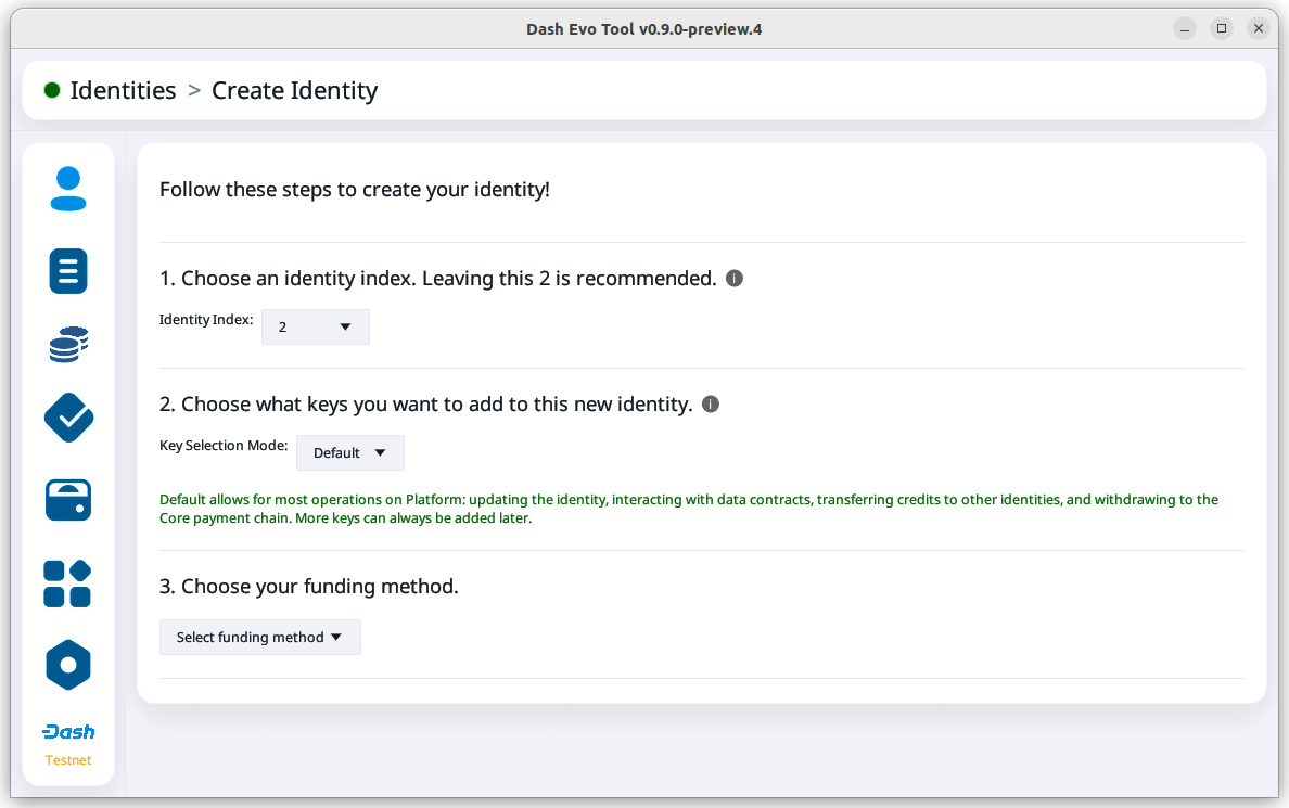 Before creating an identity, make sure you have added a Dash Evo Tool wallet.