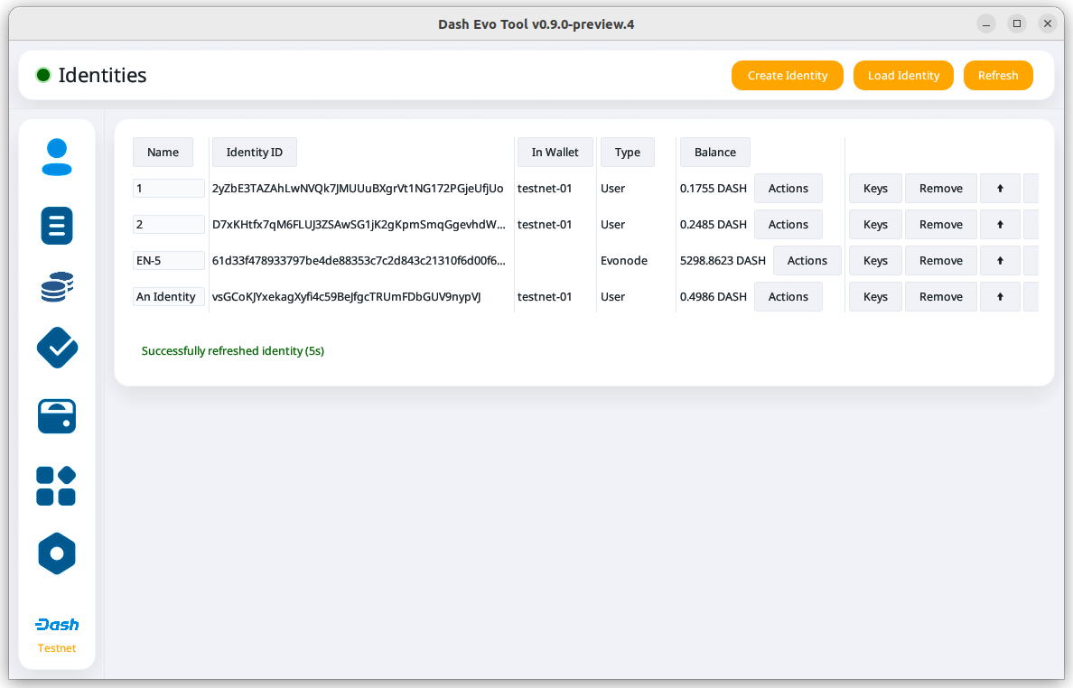 Identity screen with an evonode identity loaded#