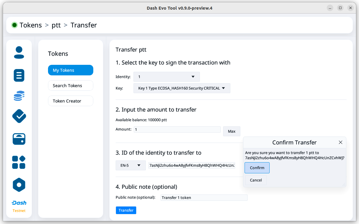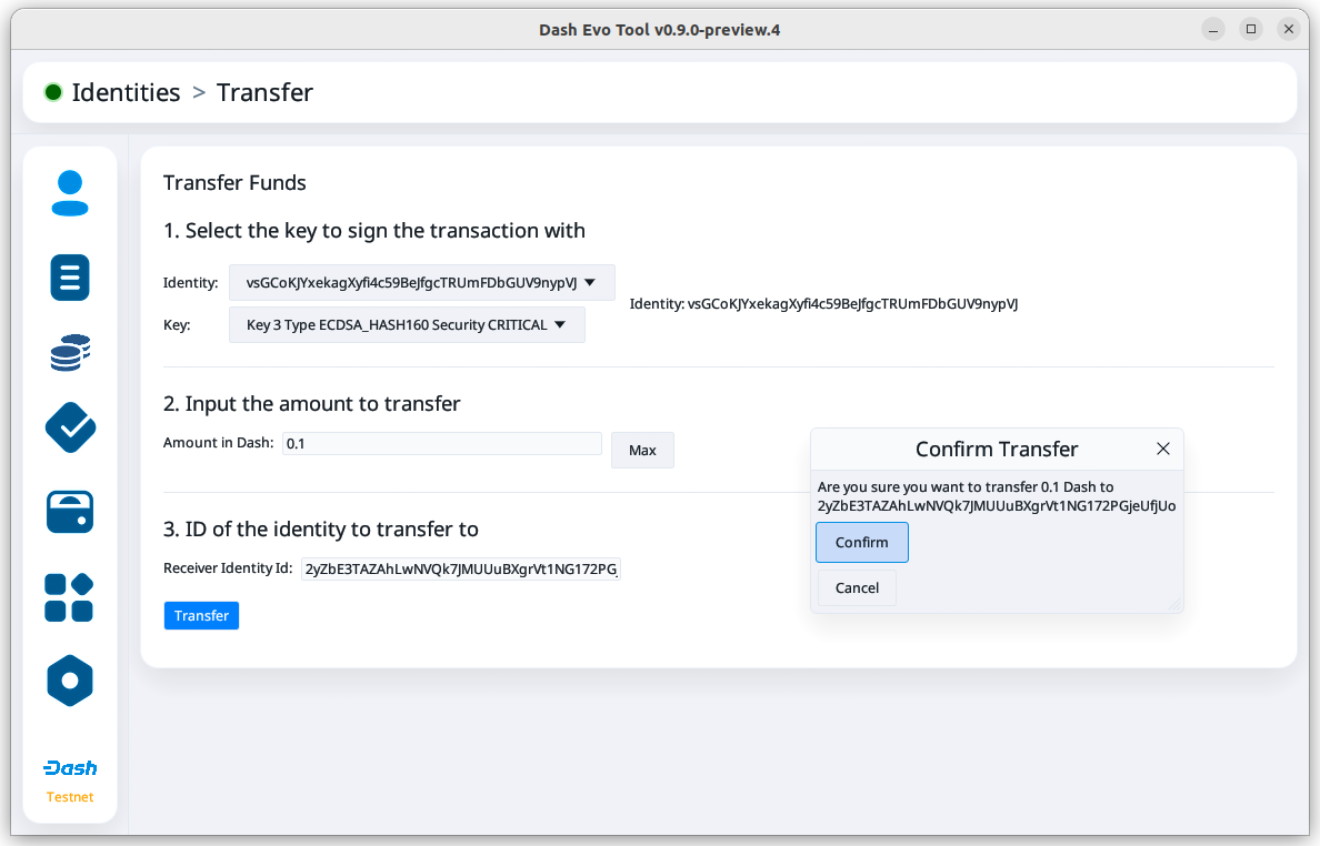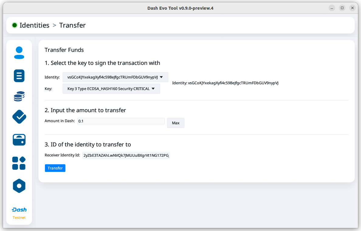 On the transfer screen, set the amount and the identity ID to receive the transferred credits. Then, click Transfer to continue.