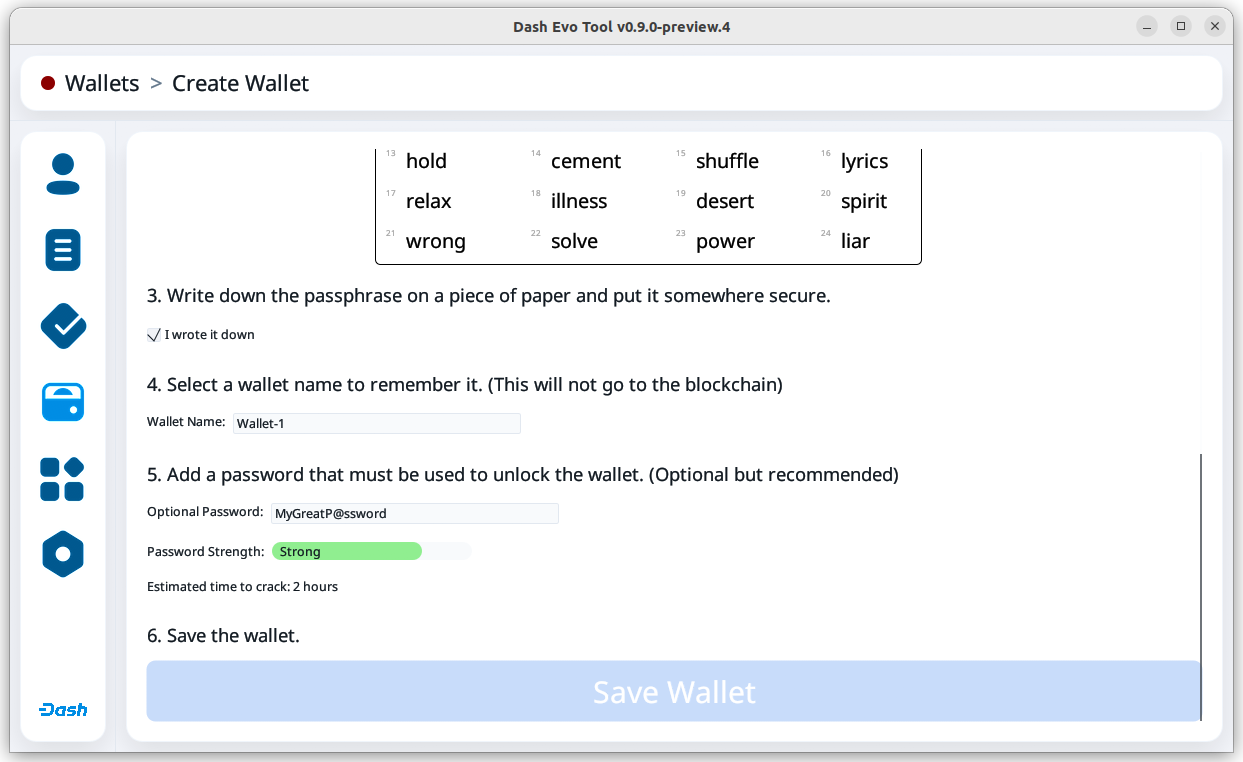 Click the checkbox in step 3 to confirm you have saved the passphrase. Next, enter a wallet name and optionally add a password before clicking Save Wallet to store the wallet.