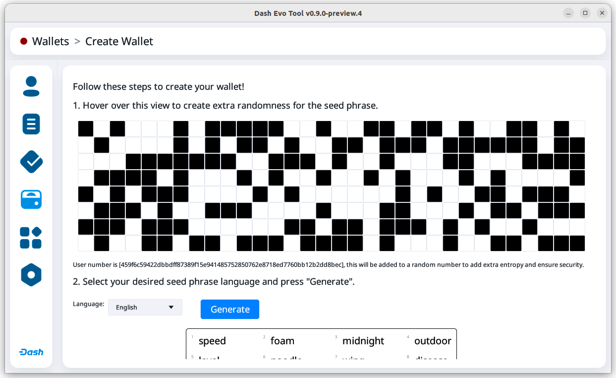 After creating extra randomness with the mouse, select your preferred language and click Generate to display you passphrase. Write it down and store it securely.